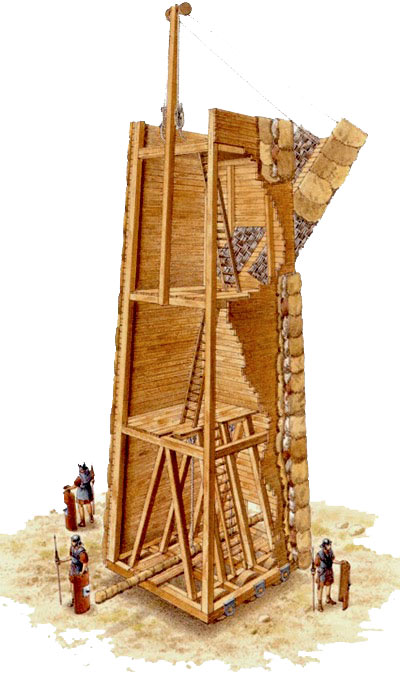 Questa torre era un'enorme macchina da guerra capace di muoversi grazie all'utilizzo di ruote capaci di supportare il peso della struttura.